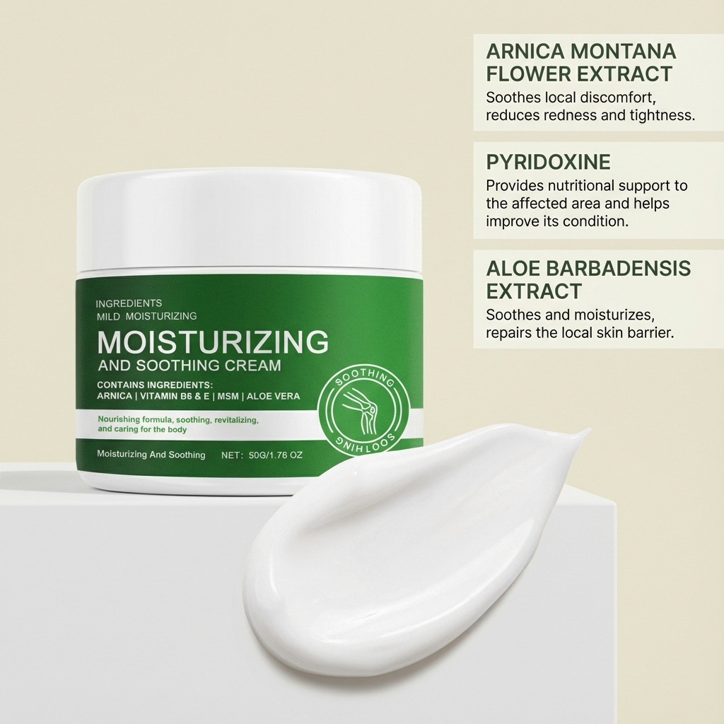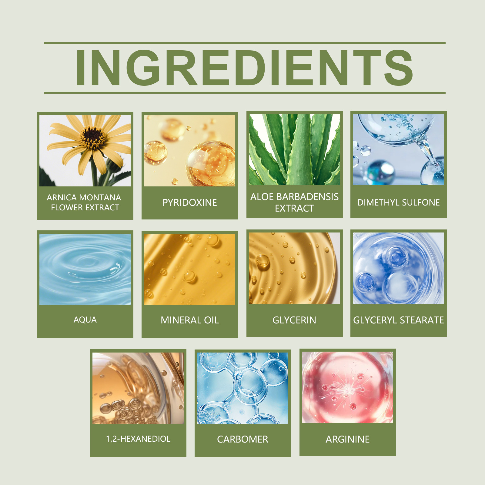 Active ingredients: Arnica flower extract, pyridoxine, Aloe barbadensis leaf extract, dimethyl sulfone